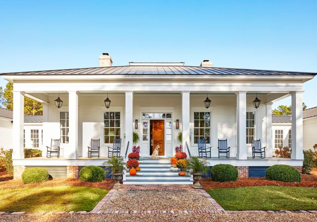 Drawing inspiration from the Montage Palmetto Bluff riverside retreat in South Carolina, homeowner MeriBeth McNeill chose a bespoke external paint shade reminiscent of Benjamin Moore's Easter Lily (OC-126) "I opted against pure white because of the dirt from our peanut fields," she explains.