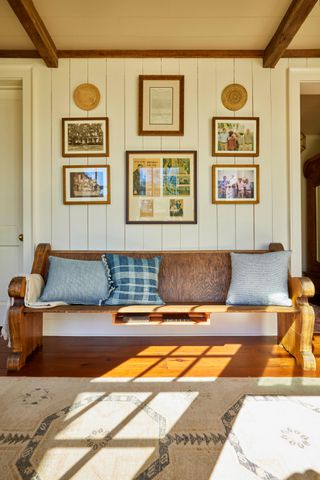 As one enters almost every space within the house, echoes of its history can be found; reused timber from the 1800s serves as unpainted molding, and old fireplace mantles have been reinstated where they originally stood. Similarly, tributes to this family’s heritage are scattered around. The corridor linking the newly constructed sections to the restored central part acts much like a historical vault. “Here stands the wooden bench where I used to sit during my childhood services,” remarks MeriBeth, pointing towards an opposite end adorned with another familiar church seat belonging to Jess.