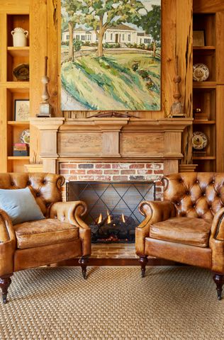 The McNeills maintained the authenticity of the home’s parlor when designing a cozy study tailored to their preferences by employing the original fireplace bricks and mantlepiece, along with incorporating the space’s over-100-year-old couch and side table among the decor.