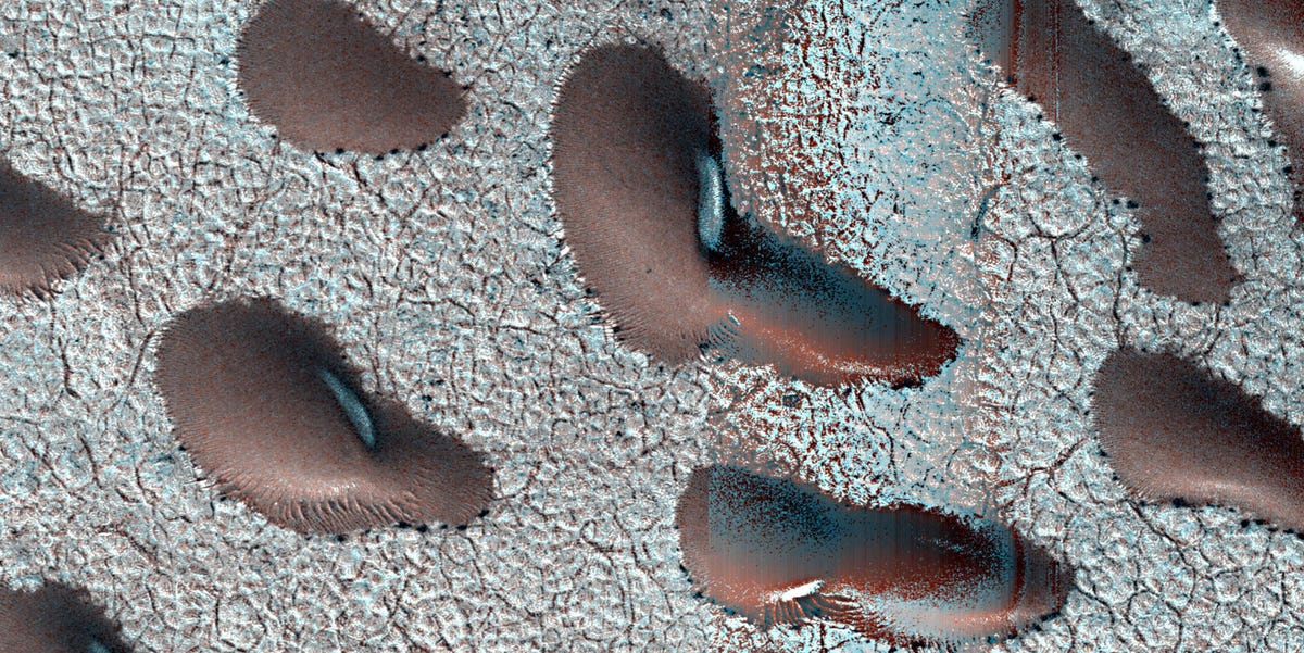 Recently imaged by the HiRISE The High-Resolution Imaging Science Experiment (HiRISE) camera aboard NASA’s Mars Reconnaissance Orbiter (MRO) reveals these formations resembling kidney beans; they are essentially sand dunes immobilized by carbon dioxide ice. Sand dunes on Mars behave like those on Earth They move as wind-blown sands shift back and forth, gradually inching along the ground. During the Martian winter in the northern hemisphere, frost settling on them immobilizes their movement until it melts away with warmer temperatures.