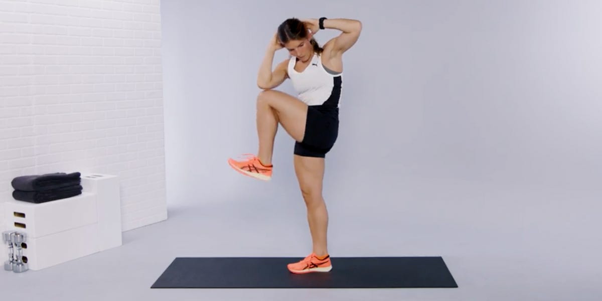 How to do it Stand upright with your fingers positioned behind your ears, elbows extended outward, and your core muscles activated. Keep your foot pointed as you lift your right knee upward and outward, simultaneously bringing your right elbow closer to your right knee for a crunching motion. Go back to the starting position and repeat this action. Perform 20 repetitions before switching sides and doing another set of 20.
