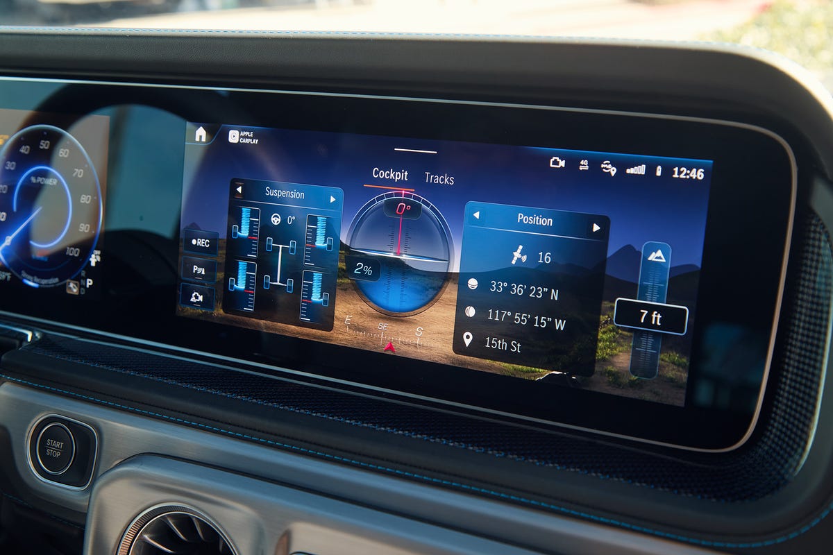 Although the G550 keeps its locking front, center, and rear differentials, the 579-horsepower quad-motor G580 doesn’t require differentials whatsoever. Consequently, the distinctive G-Wagen diff-lock buttons located centrally on the dashboard now serve alternate functions reflecting their newfound potential for individualized torque distribution across each wheel. Pressing the central button activates low range—a feature that may appear redundant considering the vehicle’s impressive output of 859 lb-ft of torque available immediately from zero RPMs. However, this lower gearing ratio aids in rock climbing scenarios; Mercedes utilized compact electric motors thanks to this setup, minimizing overheating issues during rigorous outdoor excursions. These motors employ additional lubricant oil similar to how a Porsche 993 does, enhancing cooling systems without needing periodic fluid changes. It’s worth noting that switching between low and high ranges can occur even while driving in neutral—an innovative aspect—and entering neutral also facilitates towing operations such as coupling up with a luxury coach like a Prevost. Additionally, possessing these distinct transmission modes lets owners boast about having essentially four separate transmissions, likely impressing fellow enthusiasts at local off-roading venues.