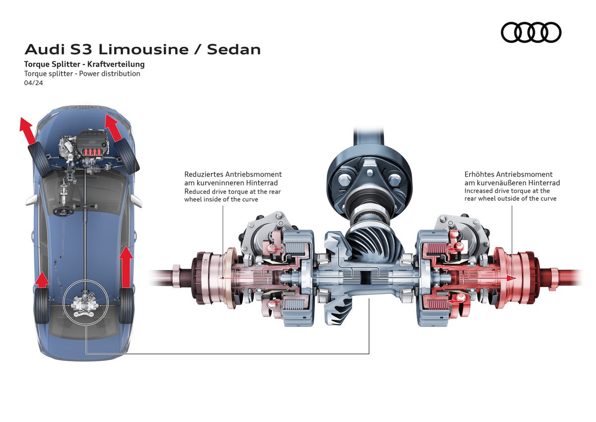 Additionally, all S3 models feature Audi’s Torque Splitter rear differential, sourced directly from the RS3. This component directs torque to the outer rear wheel during turns, enabling you to apply significantly more gas when navigating corners compared to the standard A3, which uses an open rear differential.