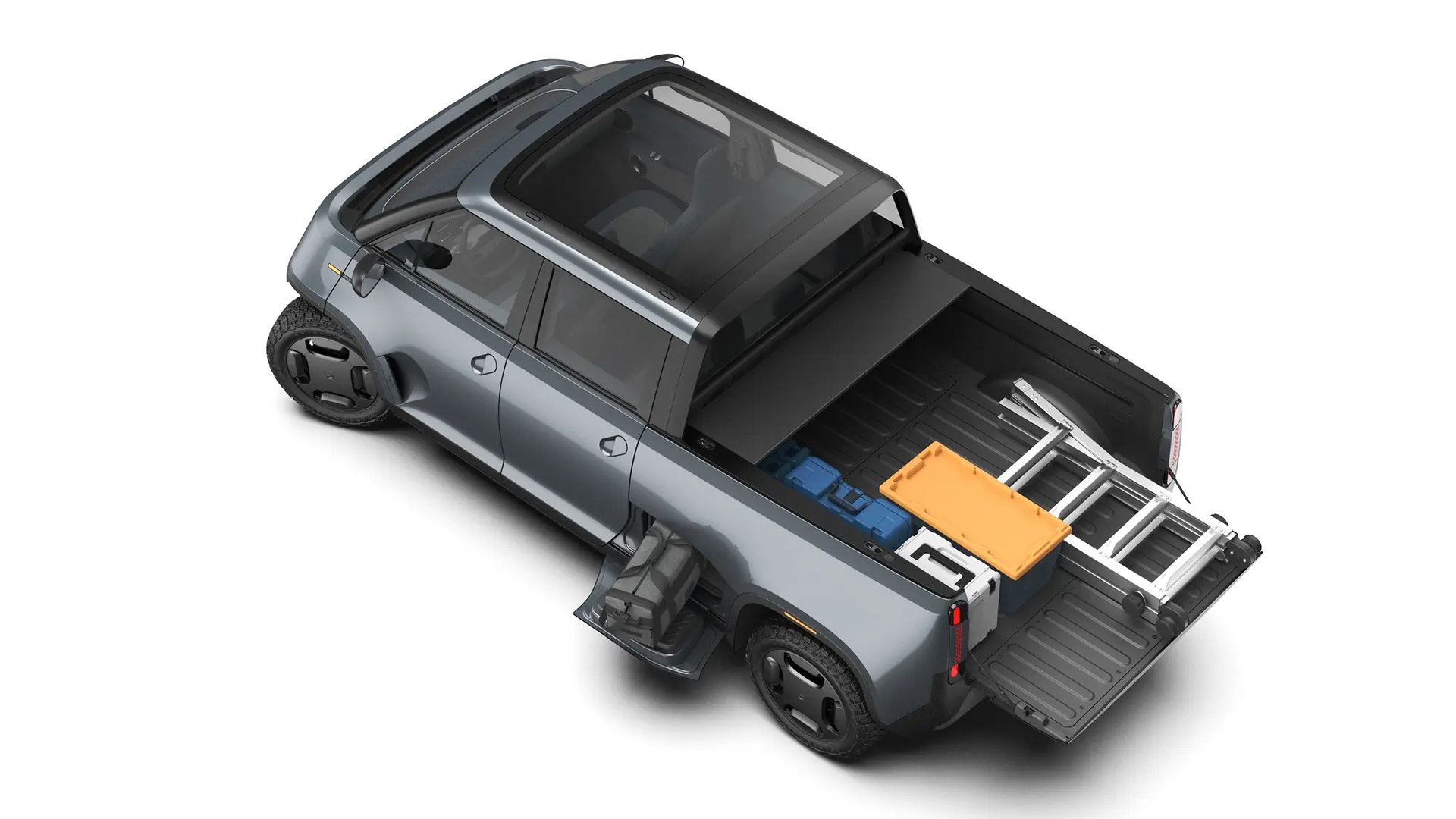 Telo states that this compact yet powerful electric pickup truck can carry 4-foot-by-8-foot sheets of plywood and even up to 8-foot-long surfboards thanks to its split rear seating arrangement. Additionally, it features a foldable tonneau cover for safeguarding cargo. Rivian -reminiscent locking storage compartment beneath the bed.