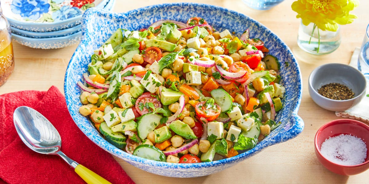 Packed with chickpeas, diced veggies, rich avocado, crumbled feta cheese, an abundance of fresh herbs, and generously drizzled with lemon juice, this chickpea salad could very well be among the most revitalizing you've ever tasted. summer salad recipes Fortunately, these produce items are accessible all year round, so you don’t have to wait for farmers' markets to start their seasonal operations; you can enjoy them at any time. healthy lunches Anytime of the year! It also stores well in the refrigerator, so feel free to include it on your shopping list. meal prep recipes you'll make on repeat.