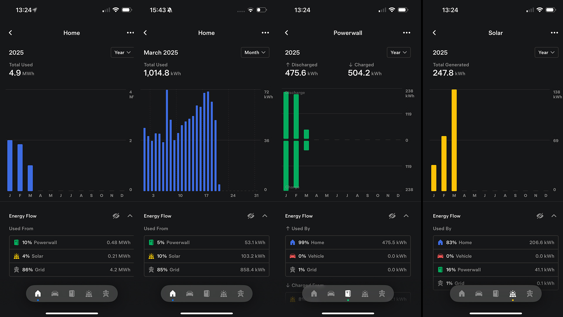 In the initial quarter of 2025, which spans three months, things improved significantly. The breakdown was as follows: 4% came from solar power, 10% from Powerwalls, and 86% from the electrical grid, totaling an approximate energy worth of £134.