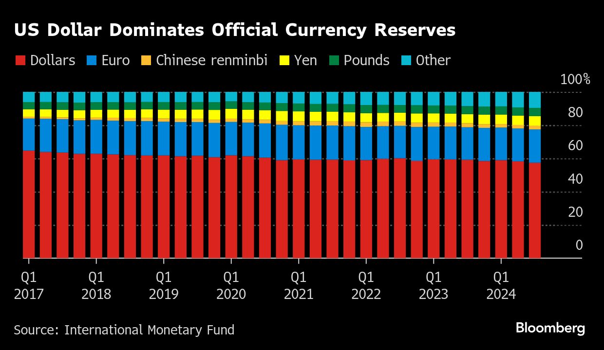 Recent data indicates that the euro accounts for just 20% of global foreign reserves, whereas the dollar comprises nearly 60%, a predominance that hasn’t changed much historically.