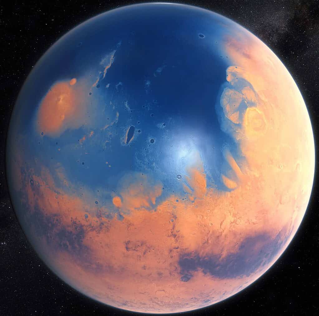 Mars could potentially have an underground reservoir of water sufficient to blanket its entire surface with an ocean ranging from 0.62 to 1.24 miles (1 to 2 kilometers) deep. Yet, since this water is locked within rocks, it would not be readily accessible—assuming it can even be retrieved. Nonetheless, the presence of such water sparks intriguing possibilities regarding the potential for microscopic organisms to thrive there.
