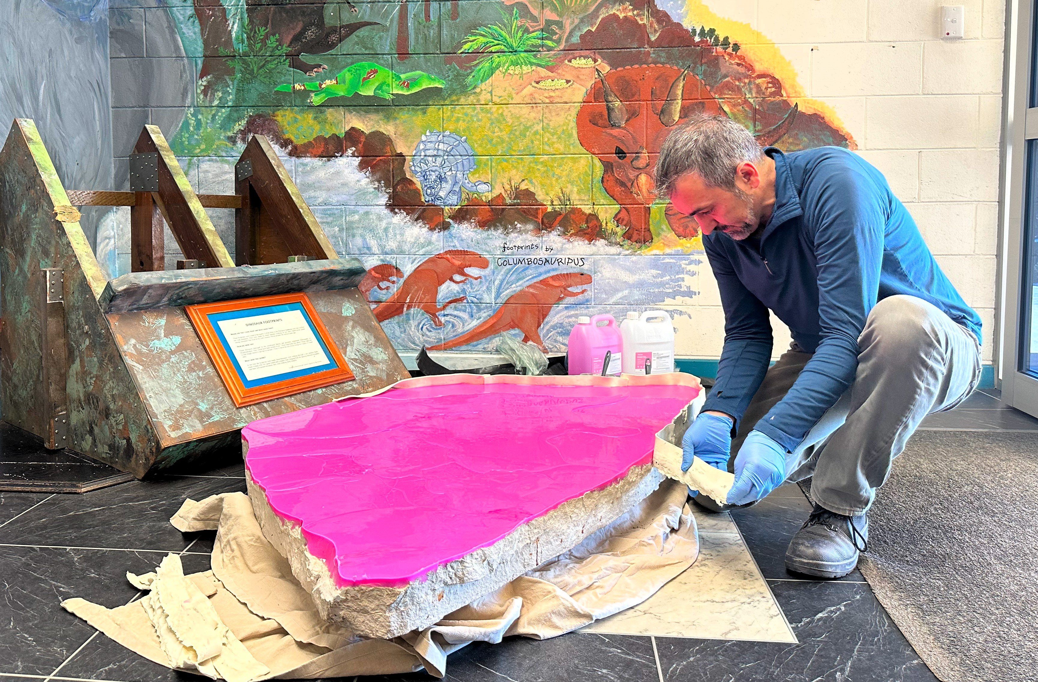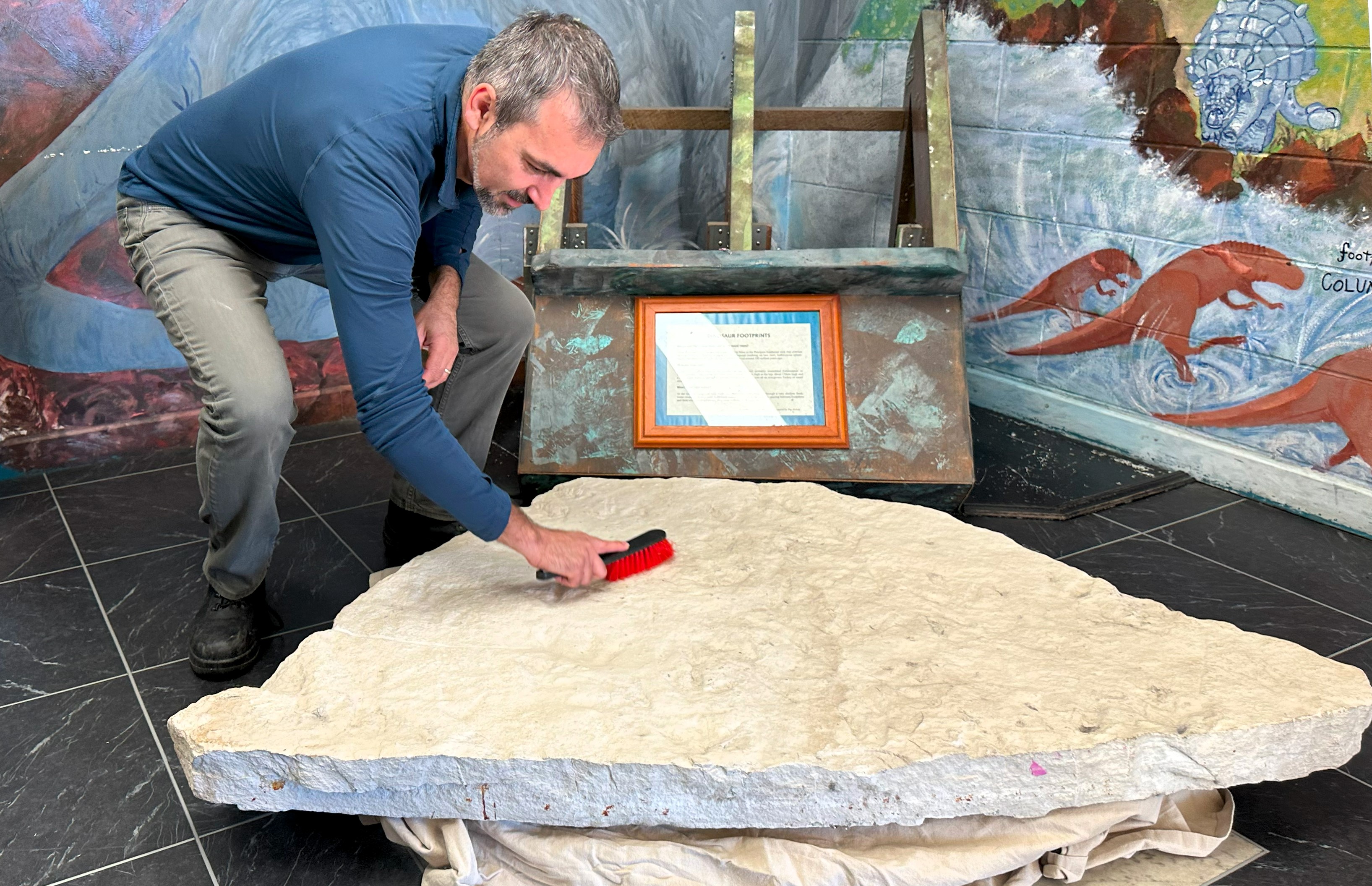 Romilio mentioned that his additional dinosaur studies kept him away from the school until 2023. At this time, two plumbers raised the boulder and positioned it on a cushion resting on the floor. Donning gloves, Romilio cleaned off the gum and dusted away the dirt.