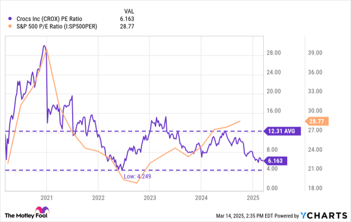 When viewed from an earnings valuation standpoint, Crocs stock stands out as the most affordable option on this list, with a price-to-earnings ratio of only 6. In contrast, the S&P 500 is significantly pricier, coming in at approximately 29 times its earnings, based on data from YCharts. It should be noted, shoe stocks For instance, Crocs typically has low stock valuations. However, as shown in the chart below, Crocs is currently trading at roughly half of its five-year average valuation.