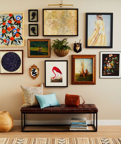 Begin with a broad range of colors, incorporate items of different dimensions, and combine varying styles (such as abstracts, seascapes, and floral designs) along with different media types (including paintings, sketches, and photographs).