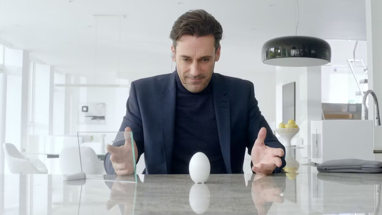 Let's take a step back for a moment: What occurs in "White Christmas"? How does this connect to "Severance"? Clearly set during Christmas time, the episode introduces us to two men—Matt Trent (played by Jon Hamm) and Joe Potter (portrayed by Rafe Spall)—who find themselves isolated together in a distant cabin for half a decade. Their relationship remains rather cold despite their shared confinement. When Matt begins recounting his past, things start unraveling. It emerges that Matt previously worked on something known as "Z-Eyes," which assisted socially awkward individuals boost their self-confidence before interacting with potential romantic partners. Notably, aside from being deeply involved mentally with these men, Matt would sometimes allow spectators to watch them approach random women. Following a tragic event resulting in one client’s death, Matt faces severe consequences. Additionally, it comes to light that Matt had experience dealing with “cookies,” devices capable of storing digitized replicas of actual persons within tiny egg-like structures. He treated these copies extremely harshly, making him appear quite ruthless towards them.
