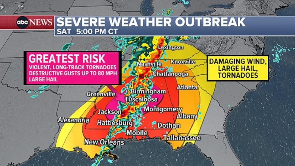 Powerful and destructive wind gusts might also affect urban areas such as Tallahassee, Florida; Atlanta, Georgia; and Nashville, Tennessee, regions which have been designated under a level 3 "enhanced risk."
