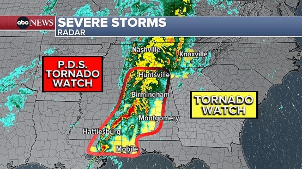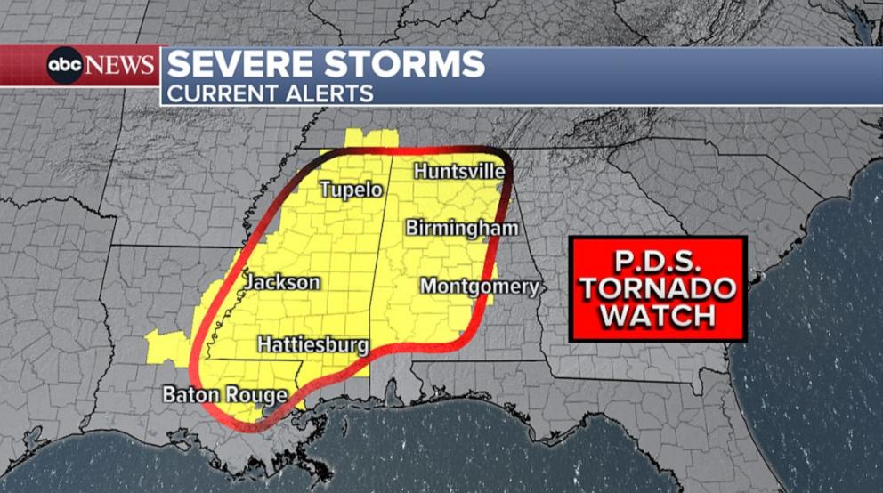 A tornado watch labeled as an "especially dangerous situation" is still active across most parts of Alabama and sections of Mississippi and Louisiana until 8 p.m. Central Time. After this period, the risk of severe tornados should diminish significantly.