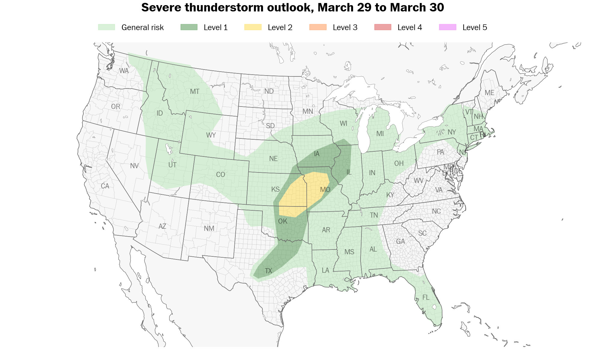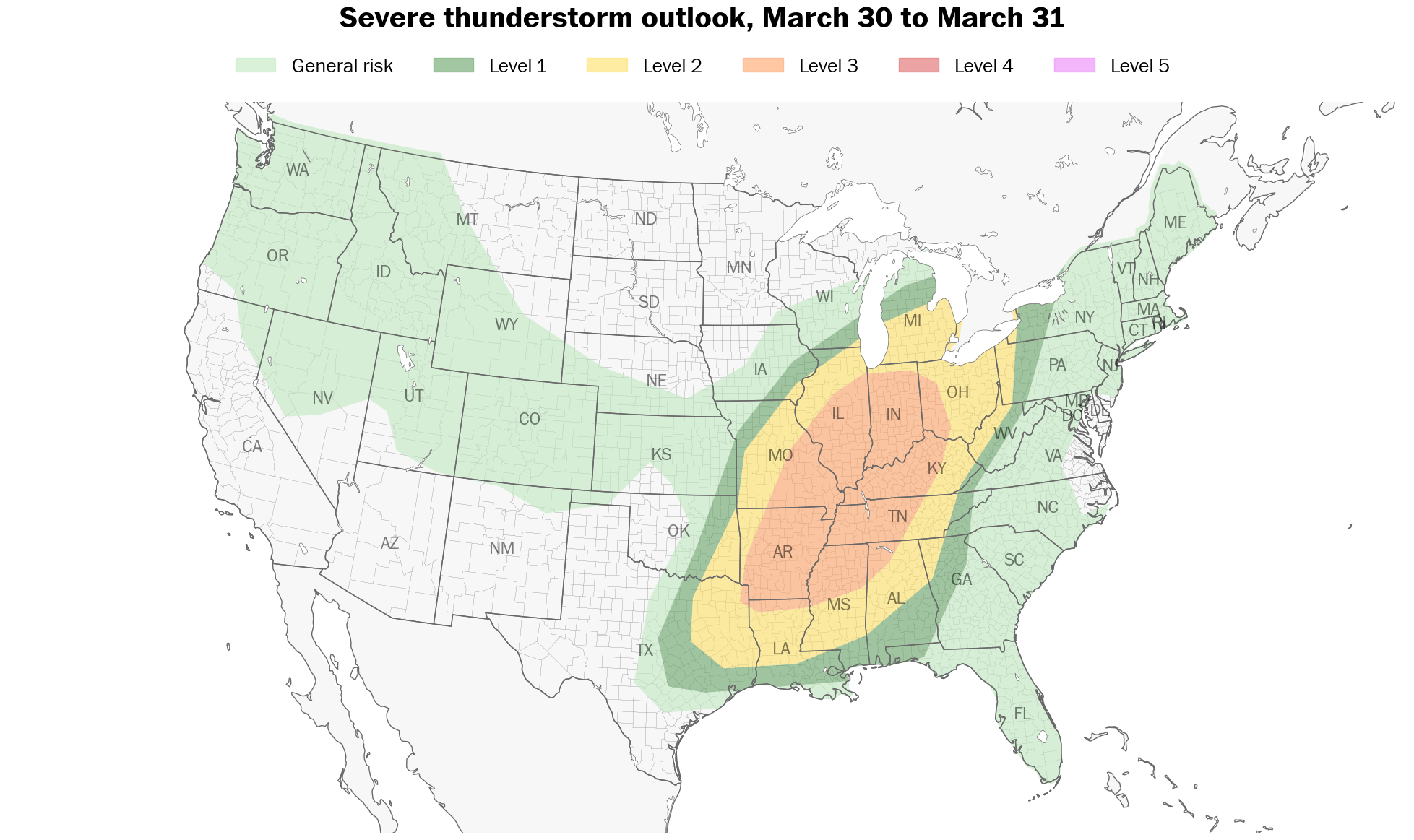 Storms kick off Saturday across the central and southern Plains, blossom in parts of Oklahoma, Kansas and Missouri. But Sunday looks to feature the greatest threat — more than 25 million people are in an enhanced (Level 3 out of 5) risk zone for severe weather, which covers much of the Mississippi and Ohio Valleys.