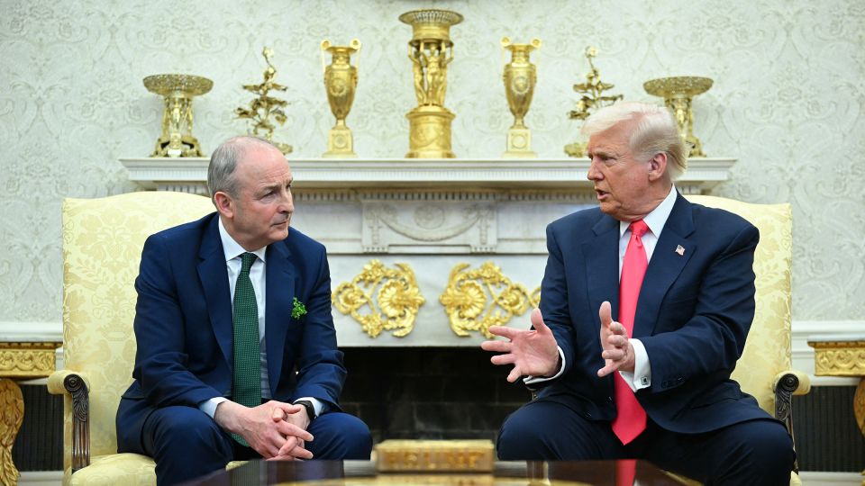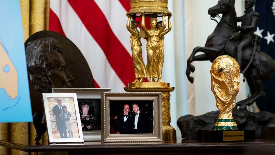 Behind his desk rests a gleaming gold copy of the FIFA World Cup Trophy, referred to as the Jules Rimet Trophy. Trump frequently discusses the upcoming World Cup, scheduled for July throughout North America, with most games set to be held in the U.S.
