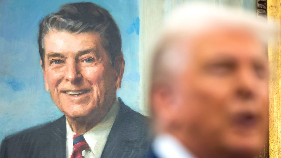 A sizable oil portrait of Ronald Reagan now occupies a prominent position to Trump’s left as he sits at his desk. In another part of the room, a newly placed image of George Washington adorns the wall above the fireplace; this is not the same modest painting that was there when Trump took office in January, but rather an impressive portrait by Charles Willson Peale created in 1776, depicting the first president holding a sword.