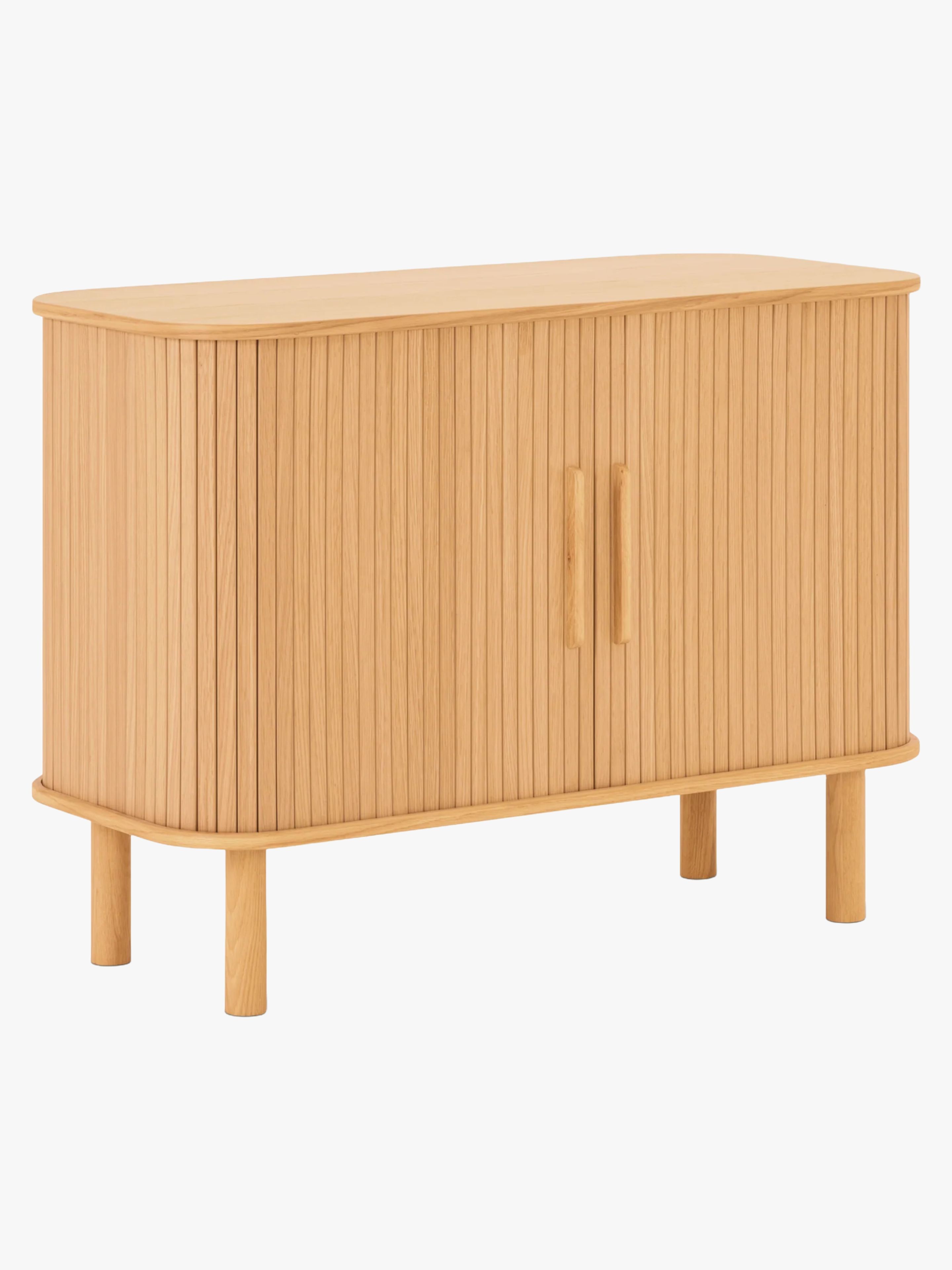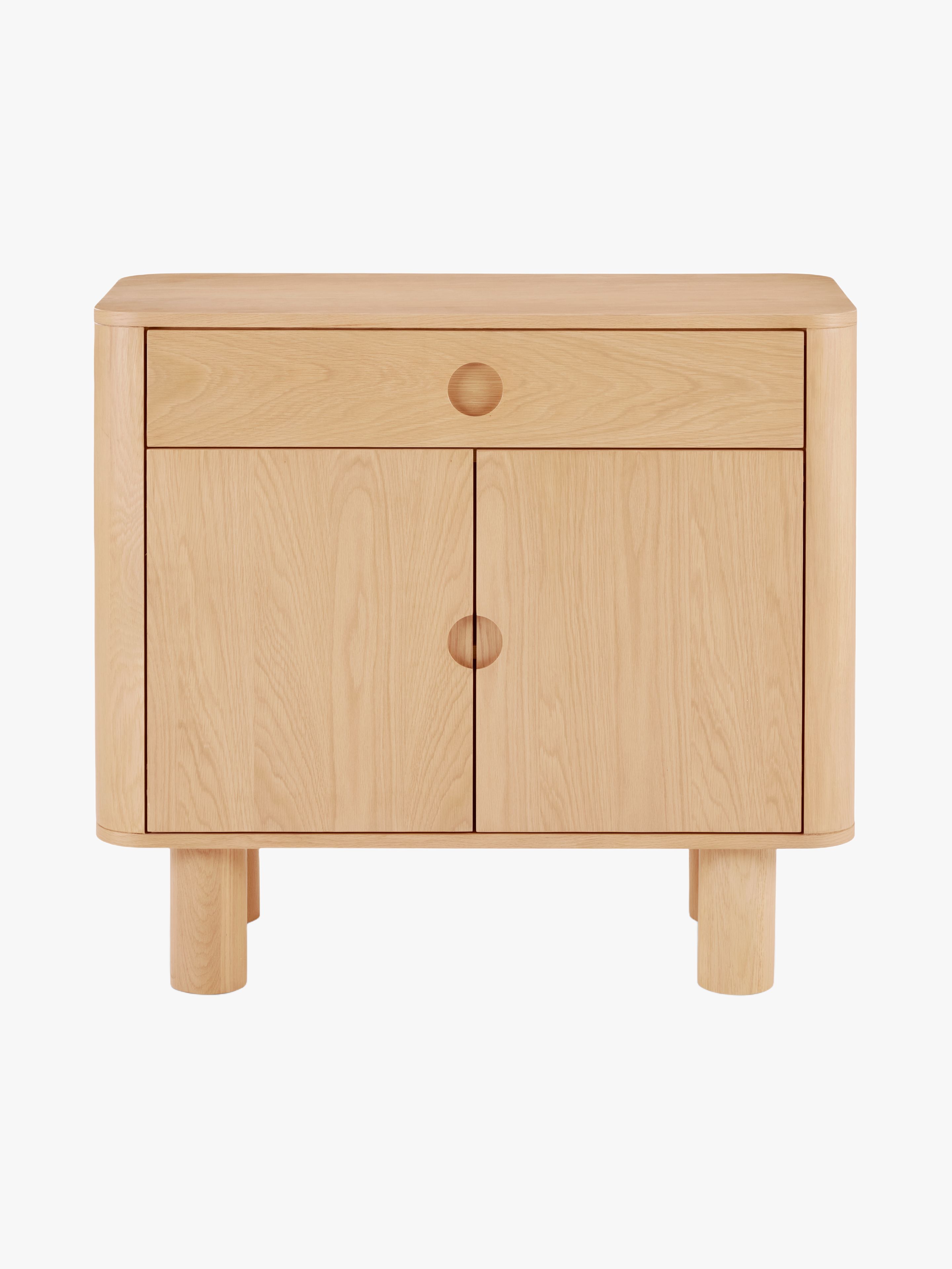The sleek design and natural wood tones of this cabinet create a soothing Scandinavian atmosphere—a perfect ambiance even before you've had your morning coffee. Its small footprint allows it to easily blend into a kitchen corner or breakfast area, while still providing ample space behind its smooth sliding doors for storing cups, coffee beans, filters, and all your brewing essentials. Additionally, the eye-catching round handles and elevated legs add an attractive touch to its overall appearance.