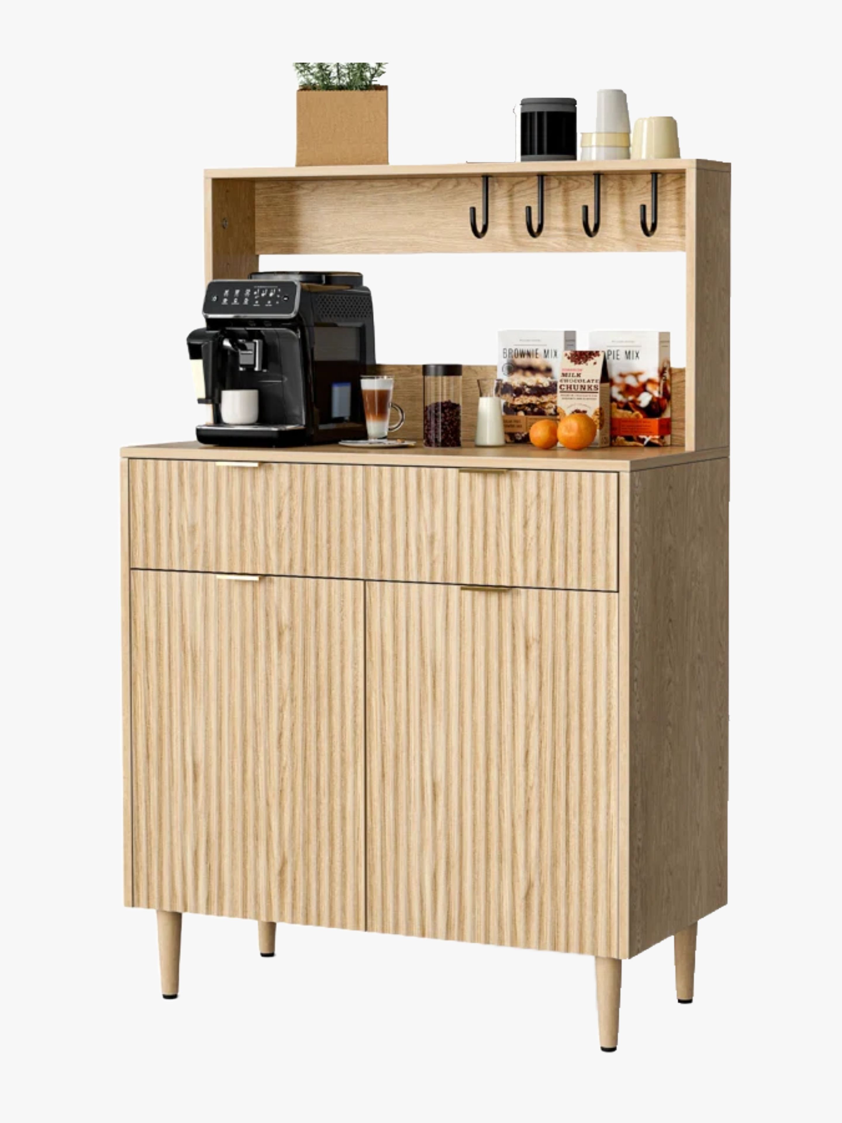 Should you desire a coffee station that appears well-organized rather than chaotic, then look no further. This piece offers ample space atop its broad surface area to comfortably fit an entire espresso system alongside additional items like syrup trays and grinders without feeling cramped. It also features convenient hooks designed for hanging your preferred mugs, while the undulating wooden panels serve as doors revealing customizable shelves ideal for storing filters and cereal boxes. tea , or that milk frother you only break out on Sundays.