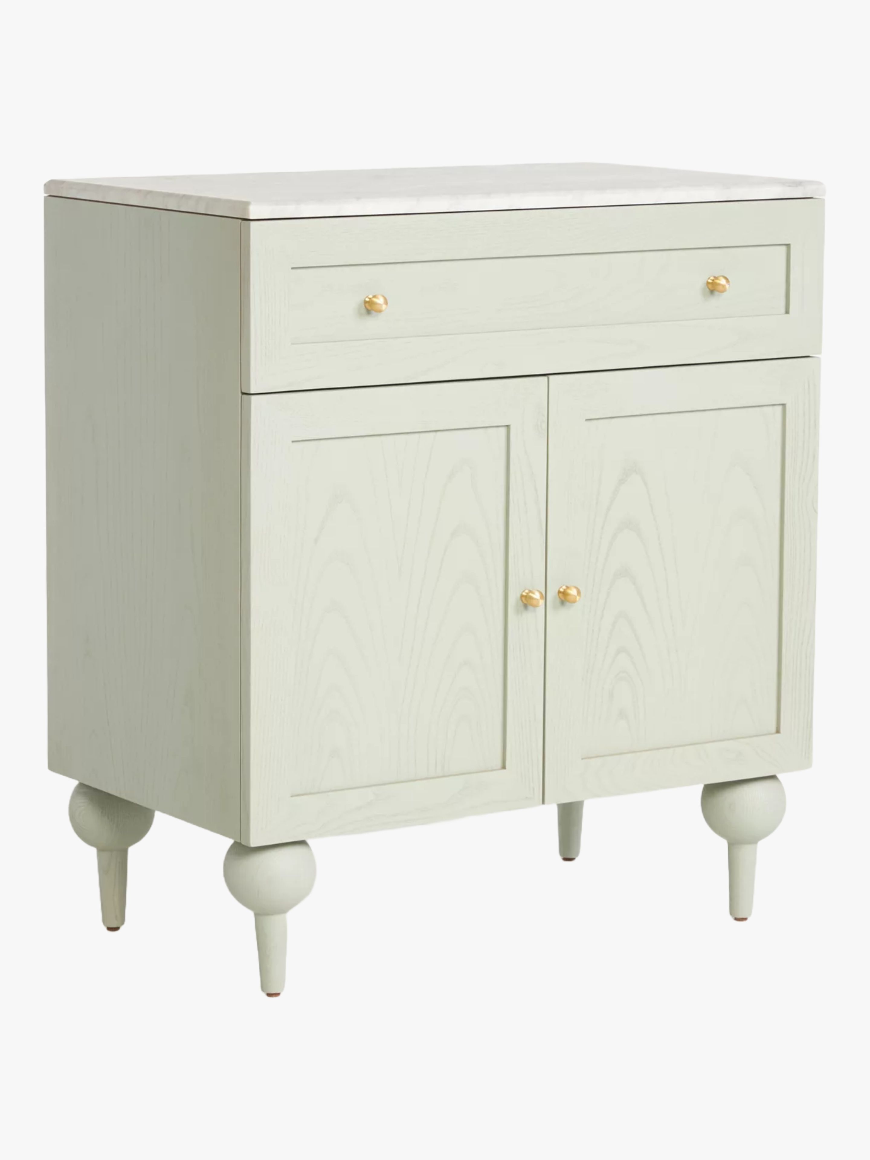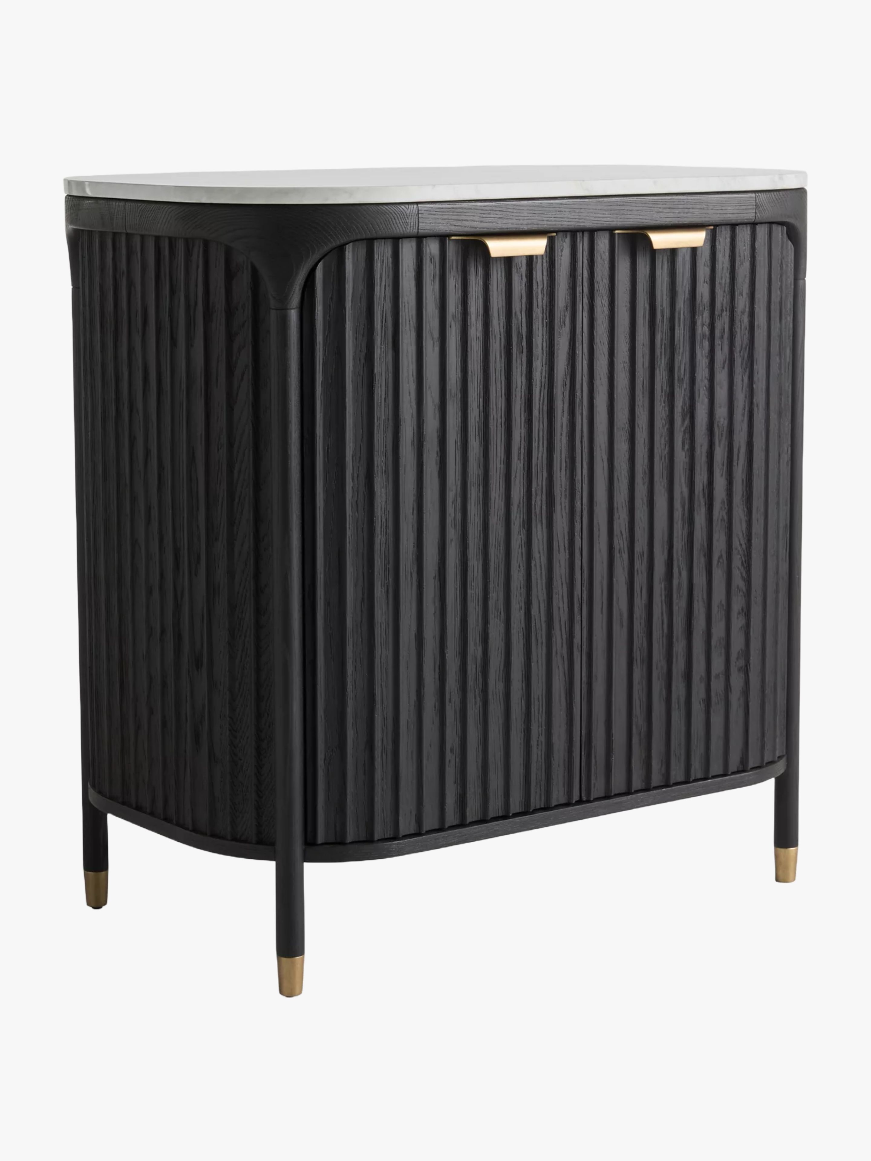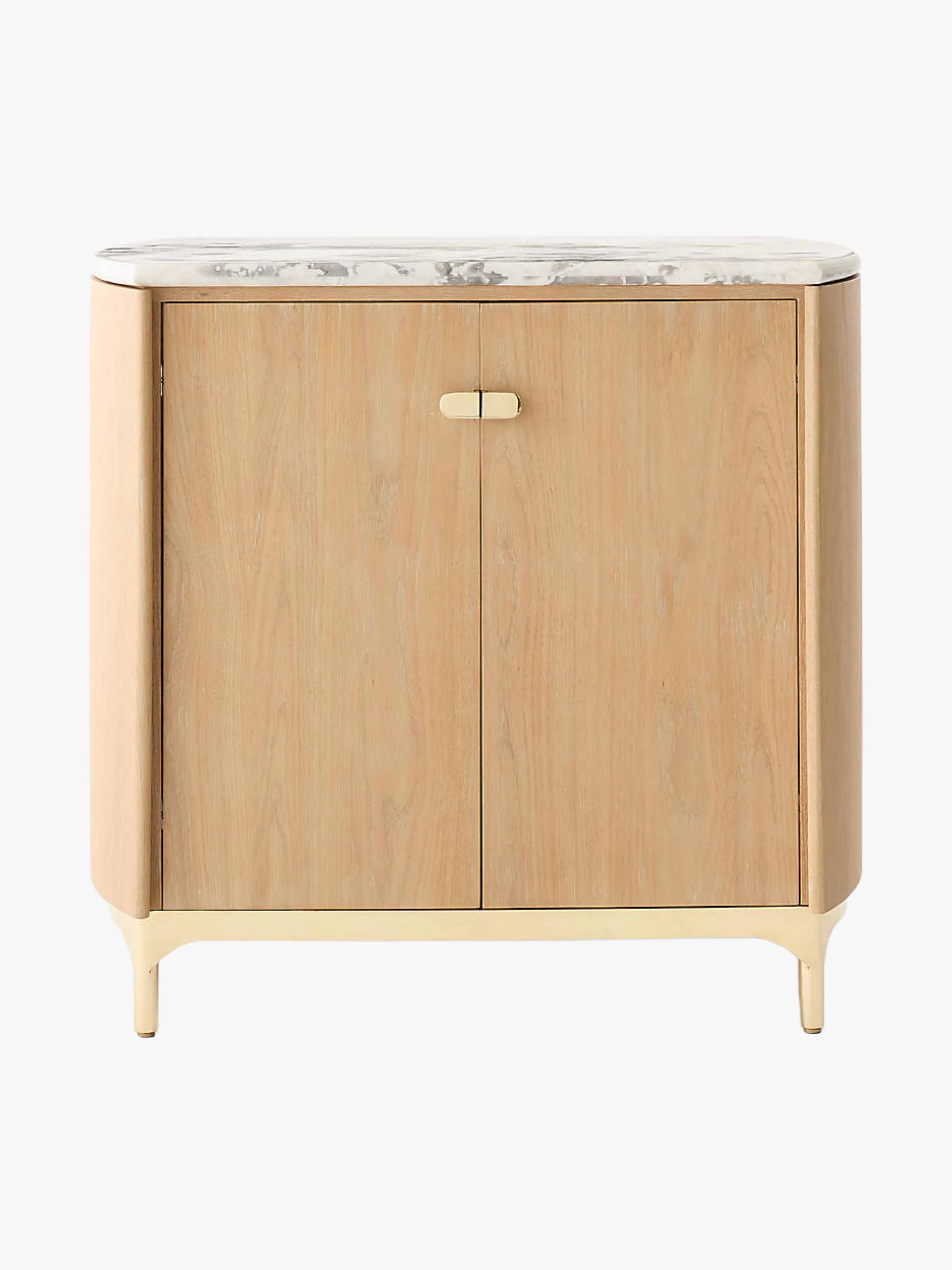 The Fern cabinet creates a luxurious initial impact with its white Carrara surface. marble The top isn't merely attractive; it's also robust, easy to clean, resistant to heat, and ideal for placing an espresso machine or pour-over equipment. The brass handles and tapered, scoop-shaped legs provide a nostalgic touch, whereas the general design remains sleek and contemporary. This standout item organizes your coffee-making routine with style and elegance.