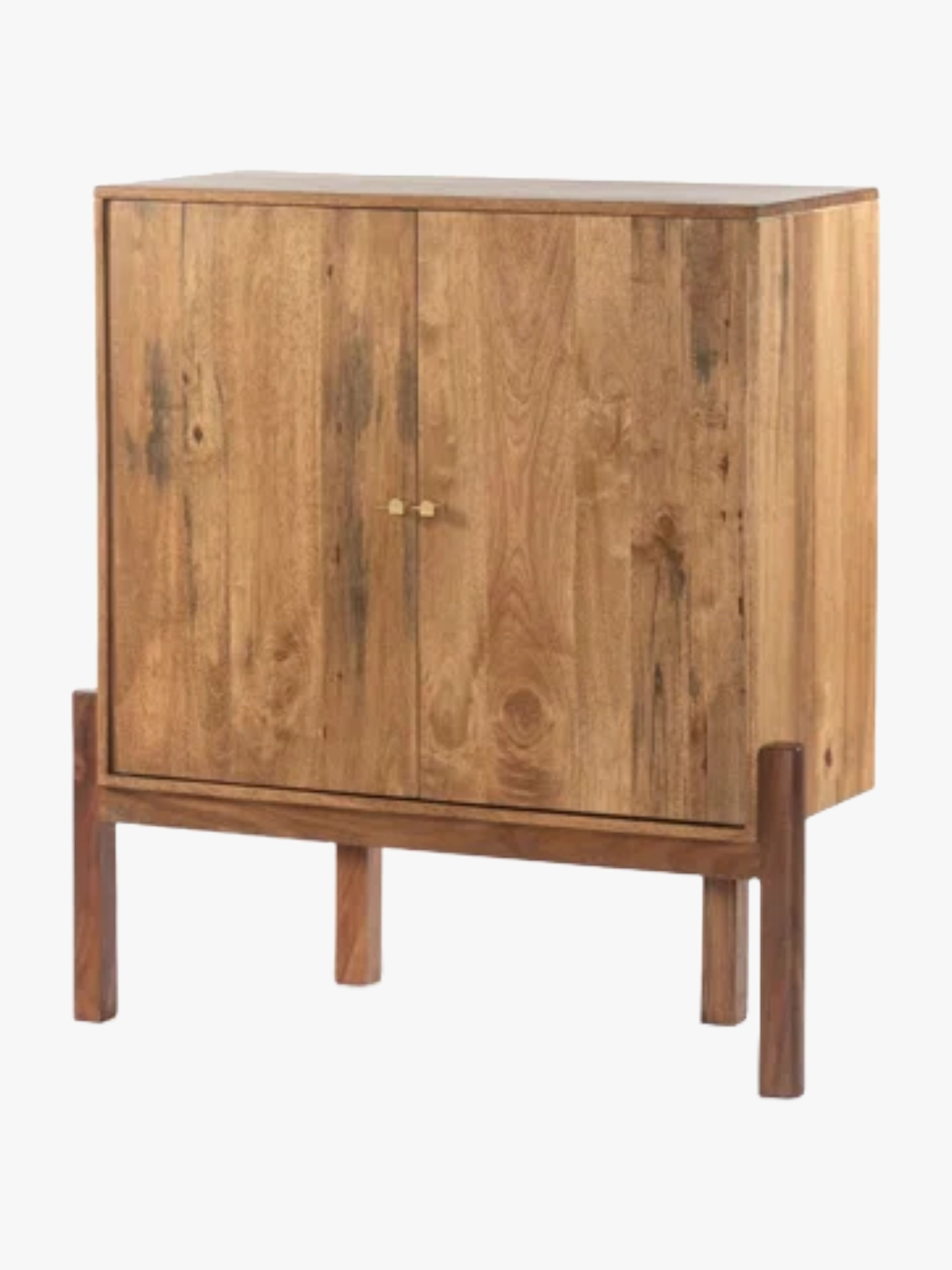Should you desire your drink area to exude sophistication rather than appearing as an overlooked addition to your countertops, the Reza cabinet is the solution. Its smoked honey wood finish adds coziness without embracing a fully rustic aesthetic, complemented by a robust yet aesthetically engaging low-profile cradle-like foundation. In essence, this piece commands attention subtly, ideal for open-plan areas where your coffee arrangement remains constantly visible.