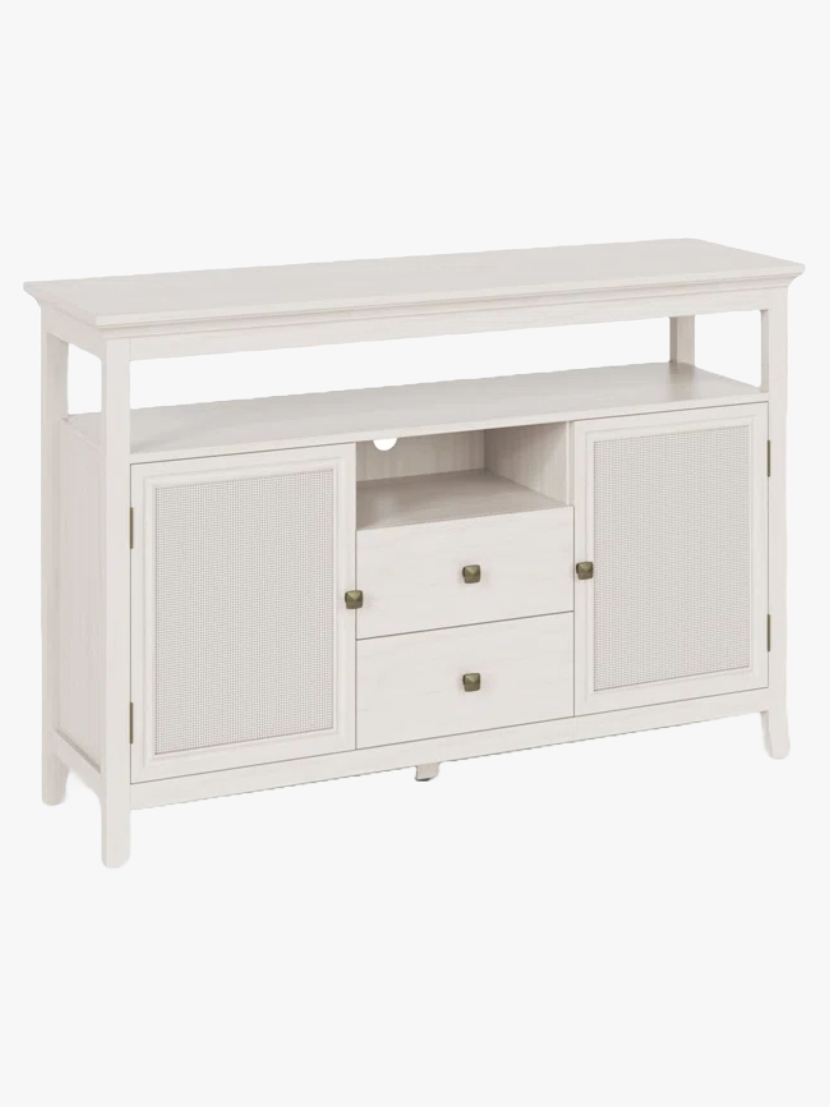 The Azarius cabinet, featuring light wicker doors and a soothing grayish-white finish, adds significant Bohemian flair to your living space. It exudes an effortless yet deliberate vibe, perfect for a brightly lit studio or a greenery-adorned dining area. The combination of exposed and concealed storage options makes this unit both organized and adaptable.