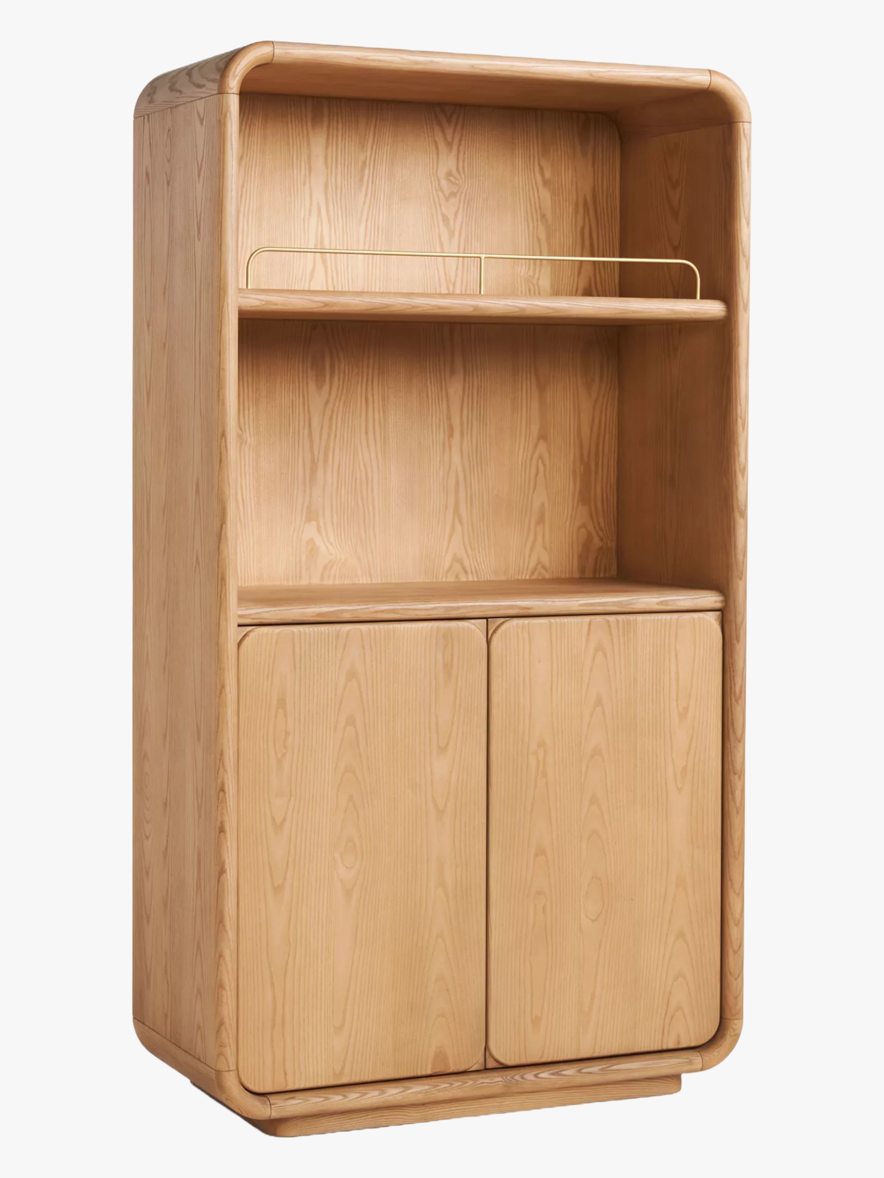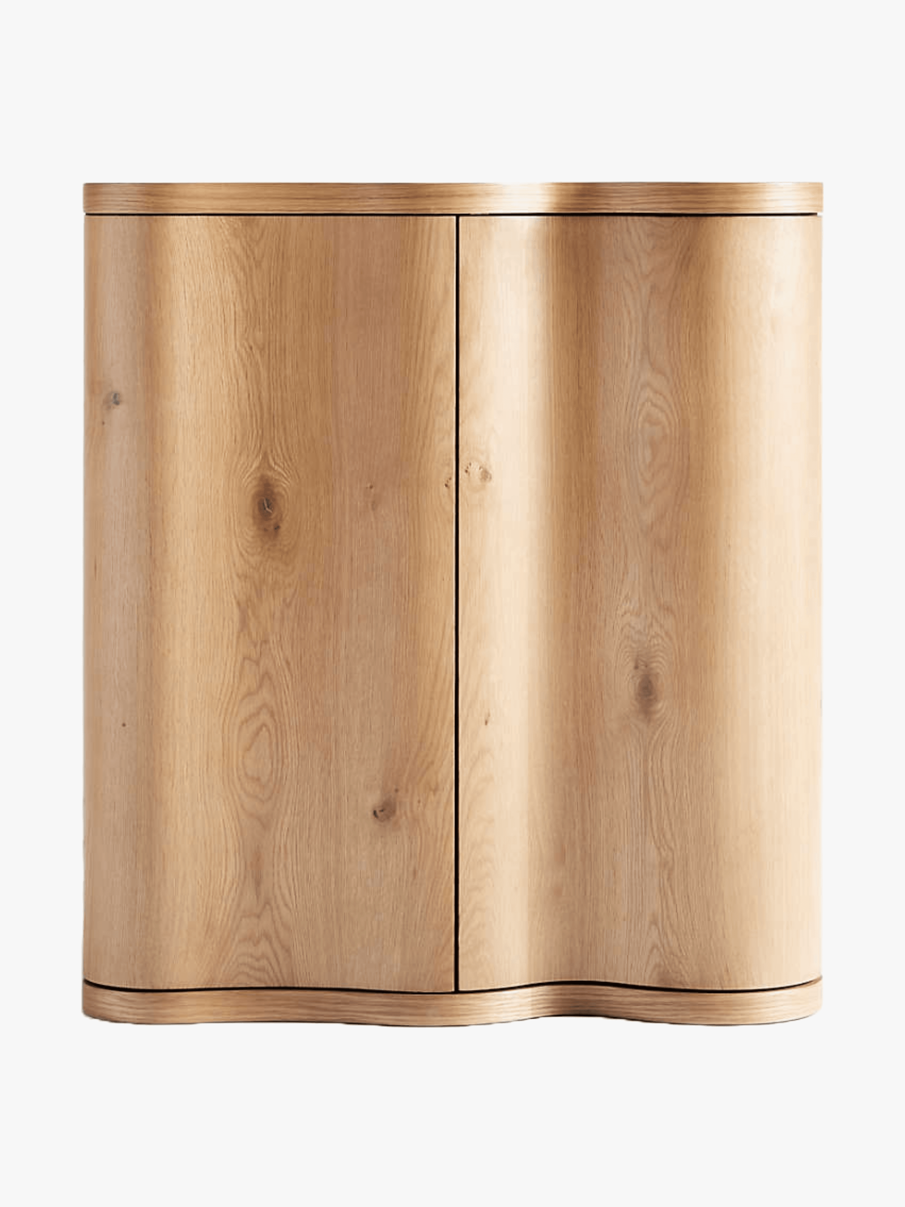 This article suggests that not only do you approach coffee with seriousness, but you also appreciate excellent design. The push-to-open doors expose an olive-green interior fitted with two rotating drawers and seven shelves designed to complement the cabinet's curved shape. Even better, this cabinet showcases the inherent imperfections of the wood, such as its natural knots and varying grain patterns, making every unit one-of-a-kind.
