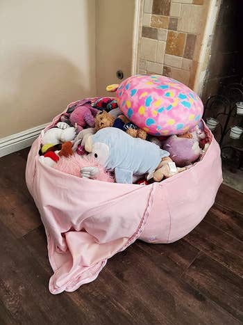12. A unicorn beanbag cover Which also serves as discreet, concealed storage for plush toys. Tidying up the cluttered assortment of stuffed animals in their room will be much easier since your child will be eager to store them away just to change this cover into a comfy beanbag chair.