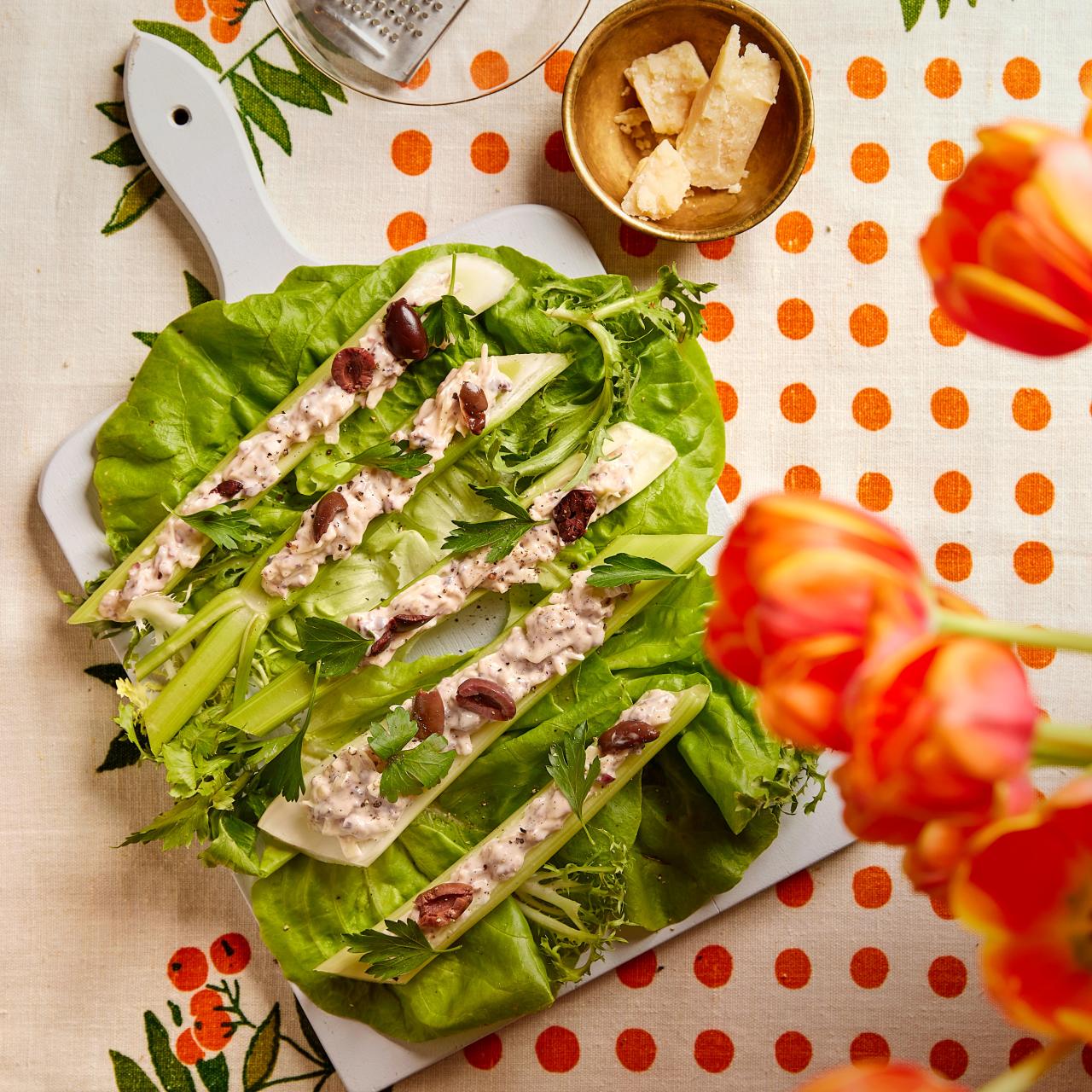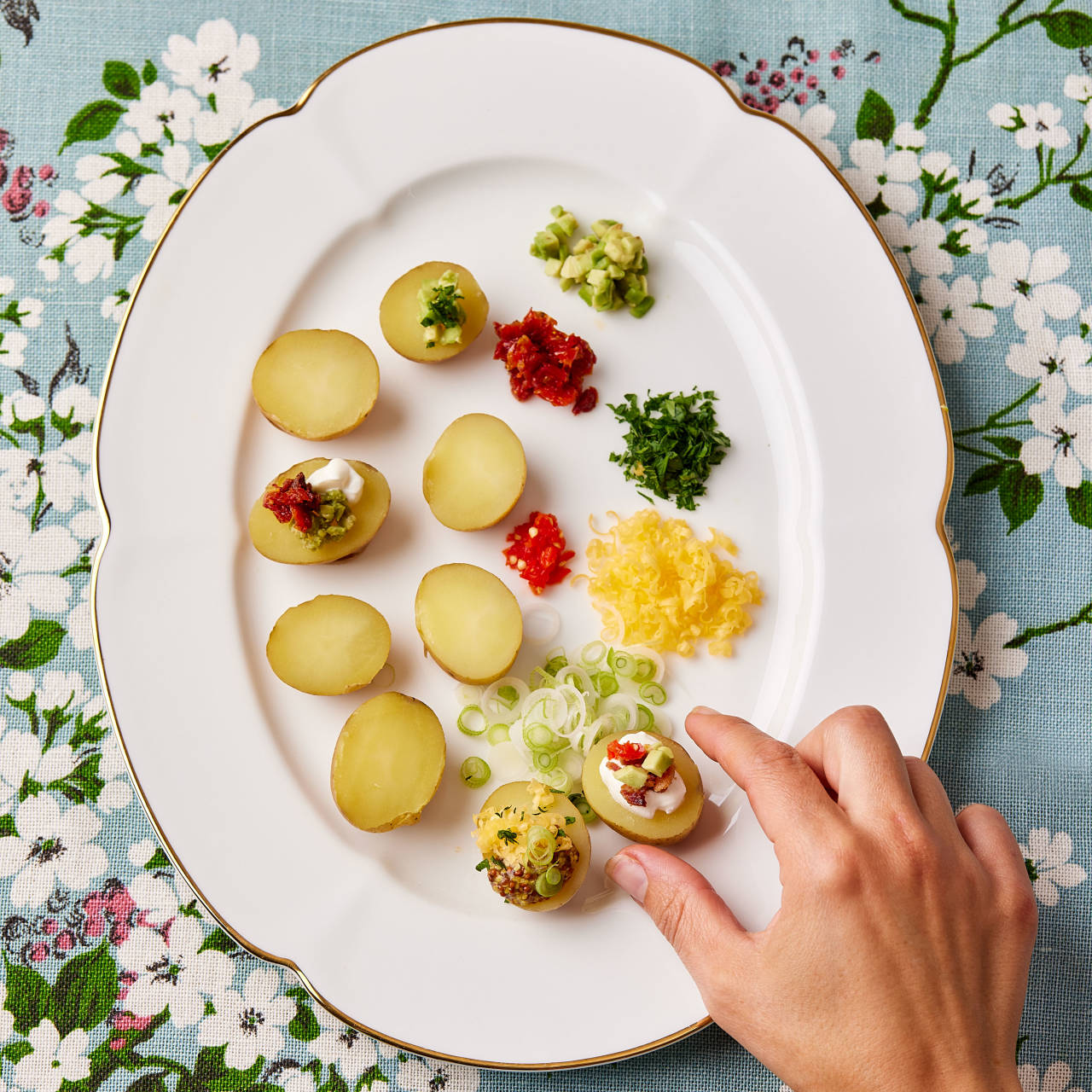 The classic ants-on-a-log received an upgrade with parmesan, anchovies, and olives (a twist inspired by an appetizer from San Francisco’s Zuni Café). I gave potato skins a modern spin by slicing boiled mini potatoes in half and arranging them alongside customizable topping options such as shredded cheese, diced pickles, herbs, and finely chopped salami or beef jerky.