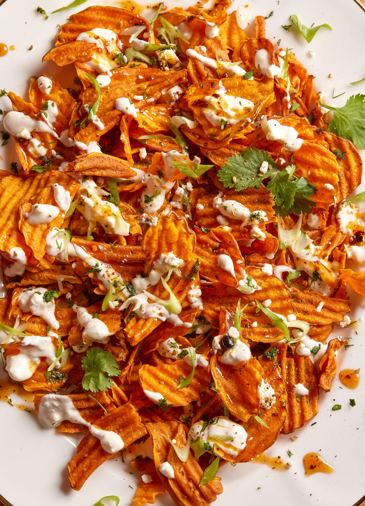 I chose sweet potato chips instead of regular ones when recreating an old favorite with chips and dip. For added flavor, I dribbled a sauce made from feta cheese and yogurt in haphazard swirls reminiscent of Jackson Pollock’s splatter art. To finish it off, I sprinkled some freshly chopped herbs along with za'atar seasoning across the top.