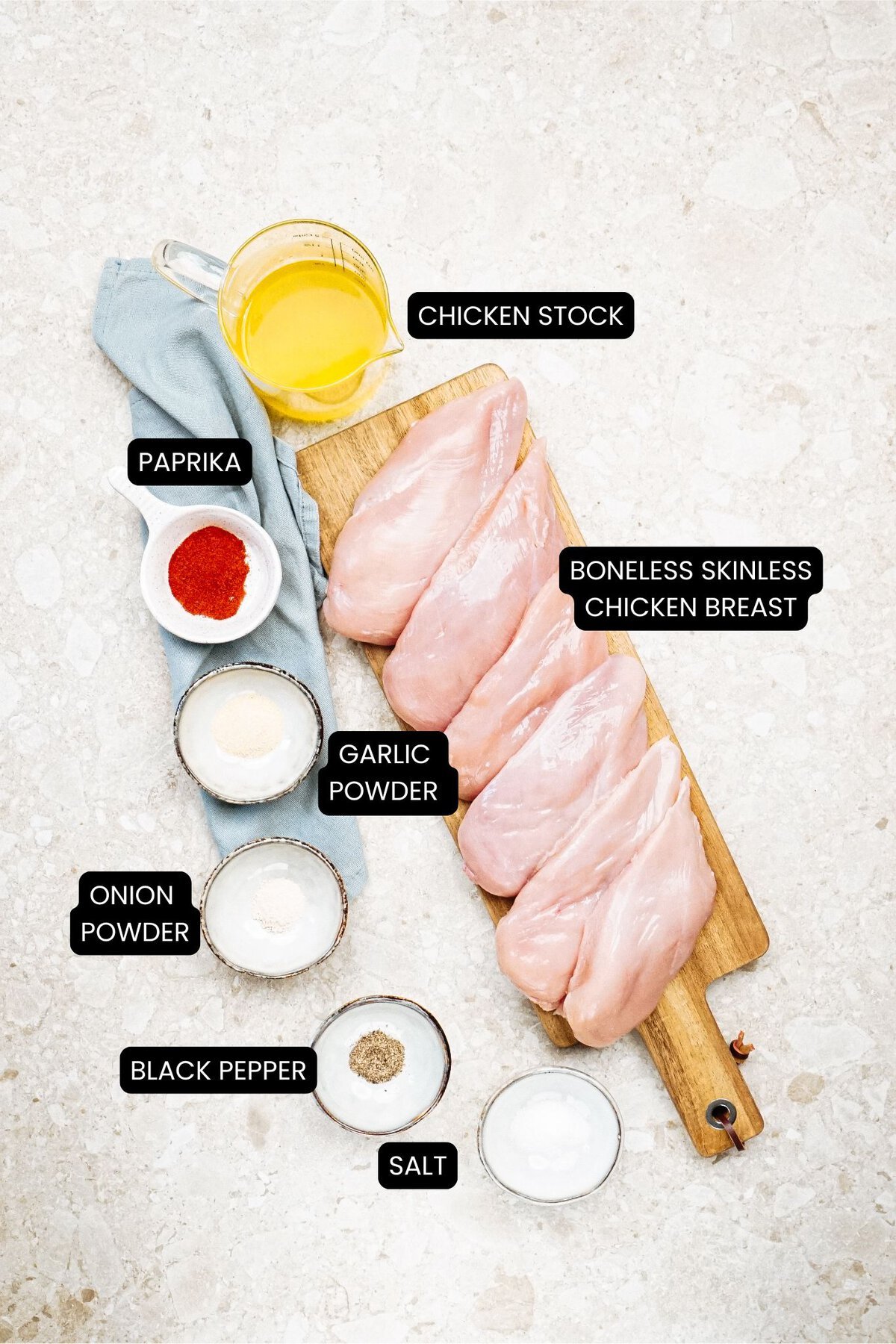 - 4 lbs of boneless, skinless chicken breasts, approximately 4 to 5 large pieces