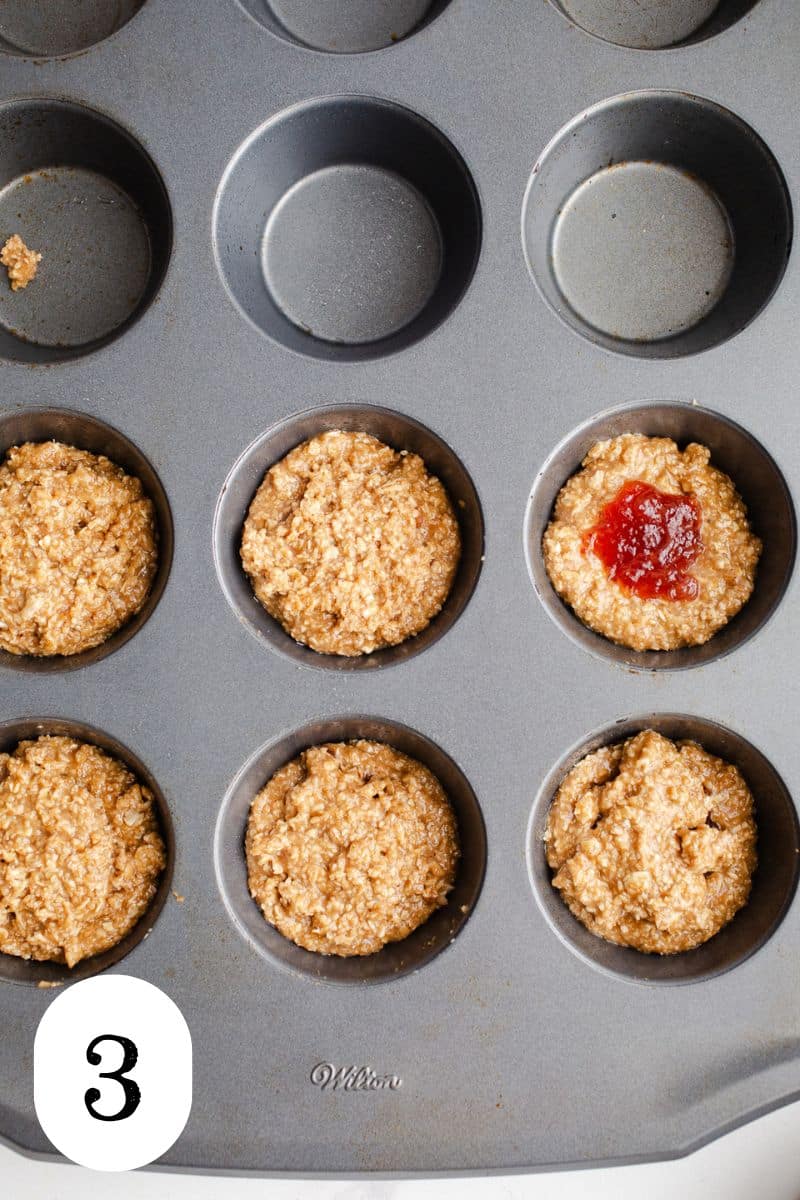 Step 3: Press half of the oat mix into the bottoms of 6 muffin cavities. Add approximately 1 teaspoon of strawberry filling to the middle of each layer.