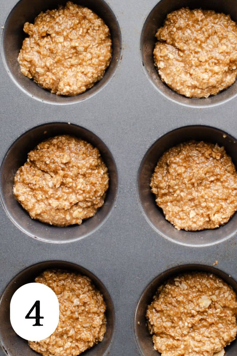 Split the leftover oat mixture and put it on top of each muffin cup, lightly pressing down to secure the edges.