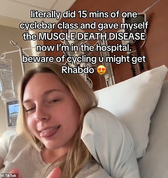 'Literally did 15 mins of one Cyclebar class and gave myself the MUSCLE DEATH DISEASE now I’m in the hospital,' wrote TikToker Savanna Stebbins in the overlay of a video clip, as she laid in bed.