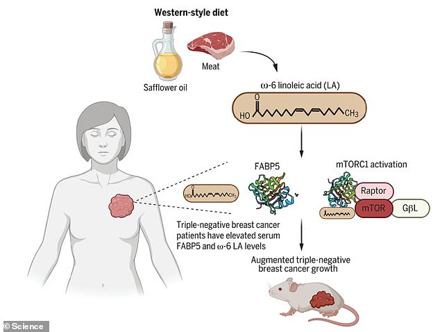Excess linoleic acid is delivered throughout the body by a protein called FABP5, which overstimulates the mTORC1 in cells, promoting tumor growth.