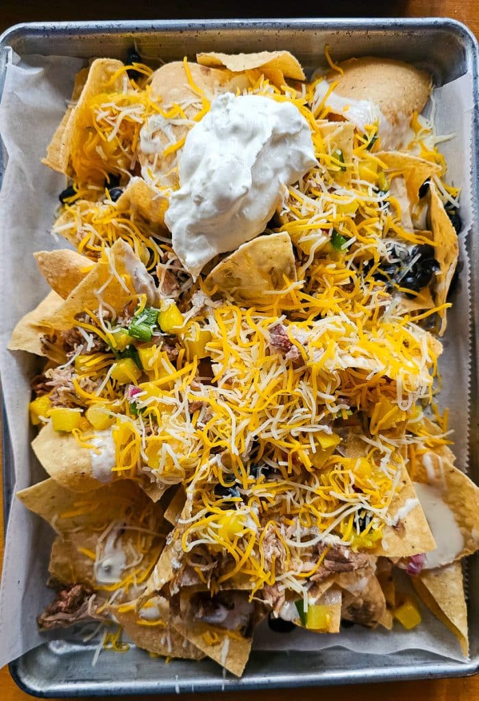 This dish offers a wonderful mix of smoky, spicy, and savory tastes, plus it’s gluten-free! Just so you know, a complete portion is served on a half-sheet pan, however, you have the option to opt for a half portion if you prefer not to have such a large serving size.