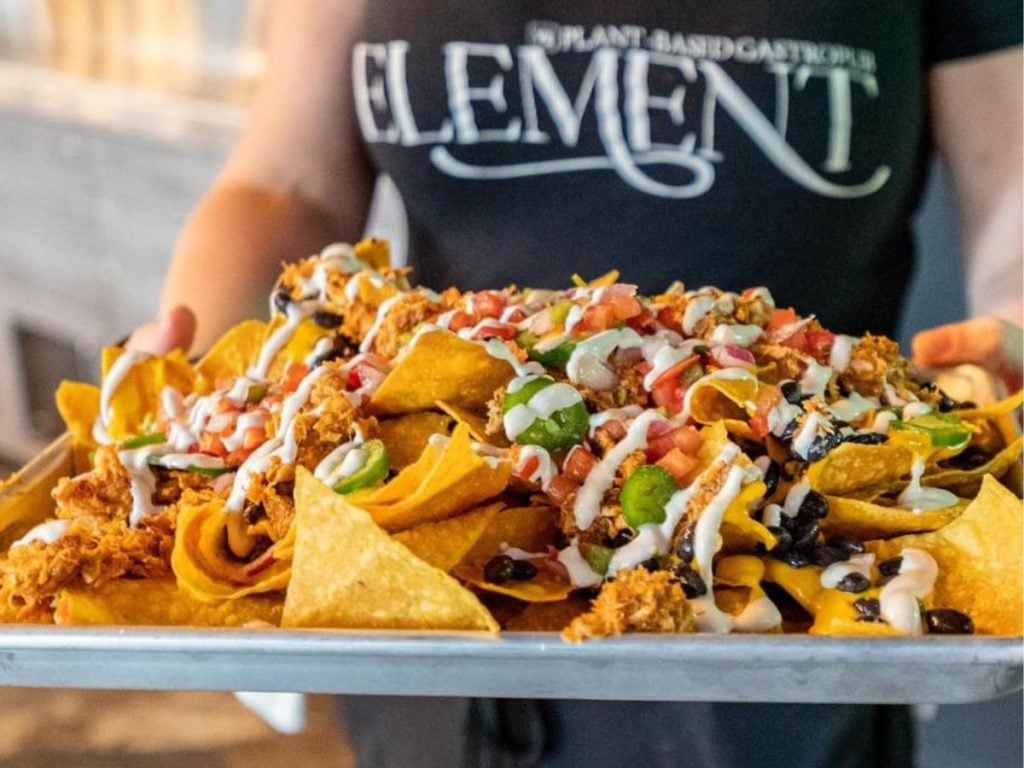 Following all this discussion about barbecue, vegans and vegetarians It might feel like being left out – so this one’s for you! At Element Gastro Pub located in downtown Raleigh, the vegan BBQ nachos serve crispy fried corn tortilla chips smothered with vegan BBQ sauce, black beans, smooth cashew cheese dip, freshly made pico de gallo, and sliced jalapeños.